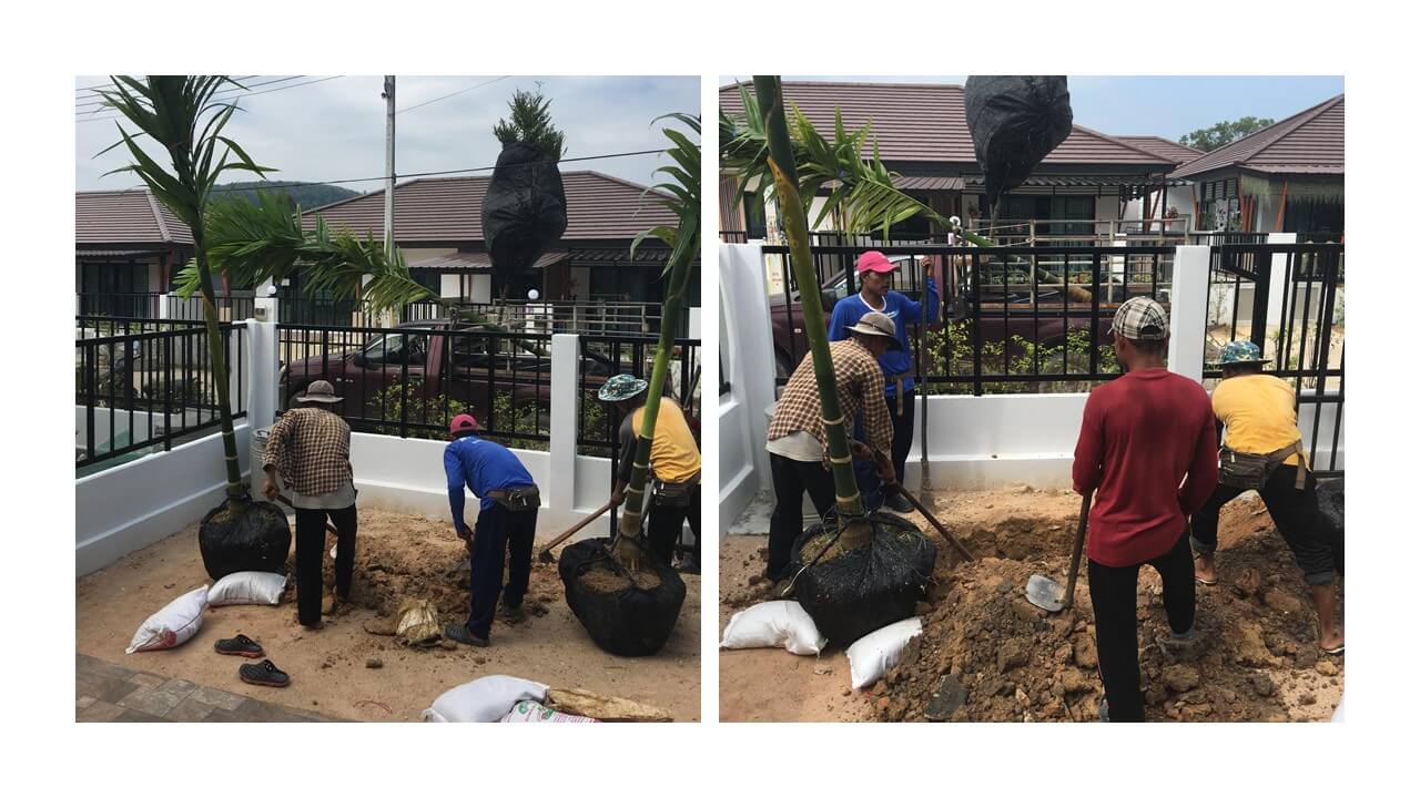 หลังจากตกลงกันแล้ว สุดท้ายผมขอให้พี่เค้าลงแค่ 2 ต้นครับ เพราะอีกต้นมันสูงเกิน กลัวด้วย กลัวว่ามันจะไปเกี่ยวสายไฟหรือล้มลงมาก่อนที่รากจะลงดิน