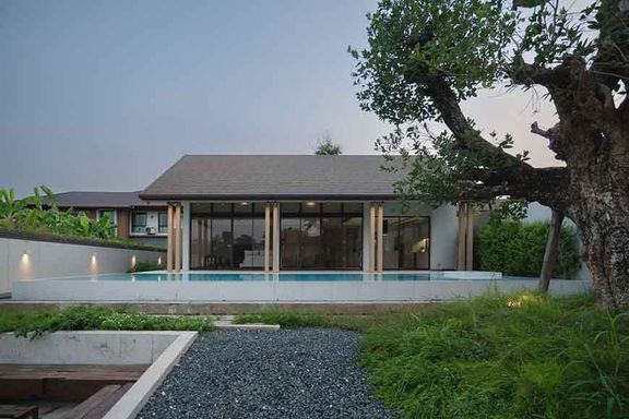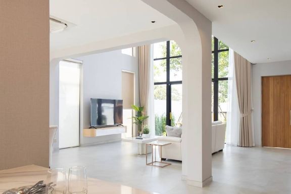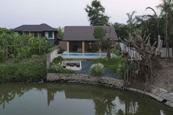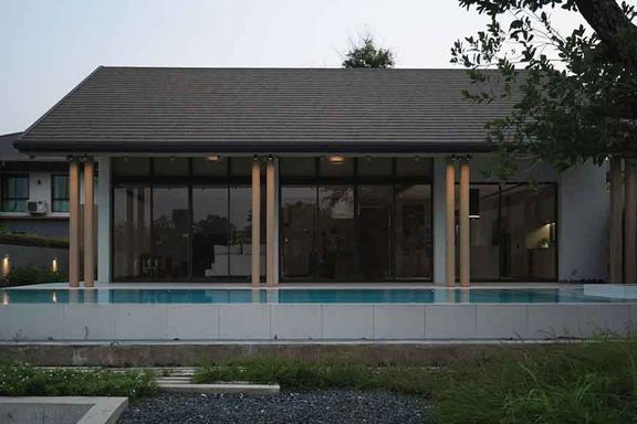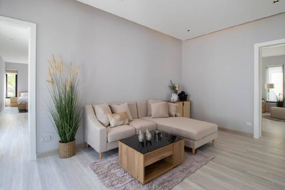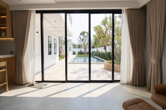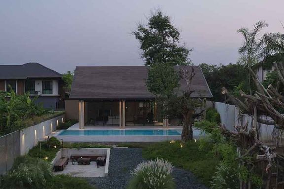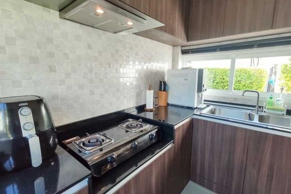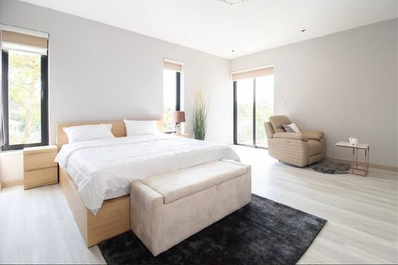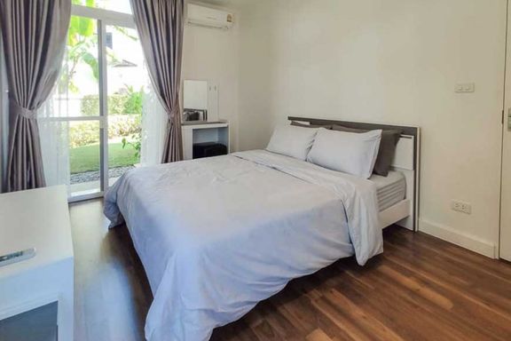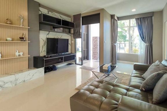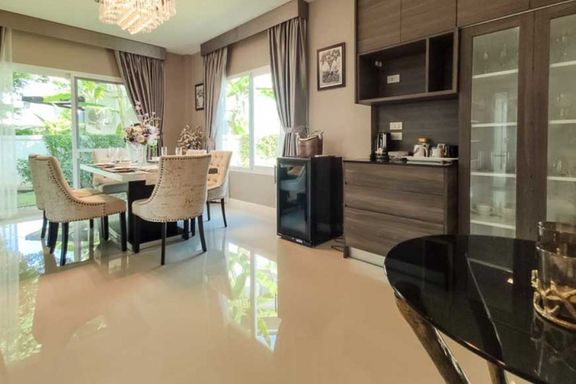 Newly built 2-story modern-style pool villa, fully built-in, and fully furnished and equipped, ready to move in, features 1 living room with a lounge...