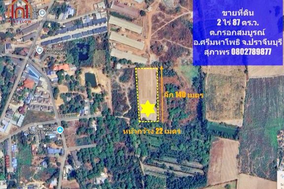 Land for sale 2 rai 87 sq.w., width 22 meters, depth 140 meters, Sri Maha Pho, Prachin Buri, filled and ready to build, Chachoengsao - Kabin Buri Road...