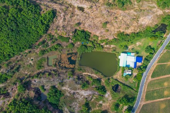906150 Land for sale, 5 rai 123.7 sq.wa Price 29.5 million baht Bang Phra Reservoir, Si Racha Adjacent to a stream and pond The land has shady trees N...