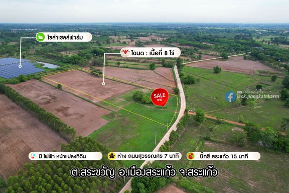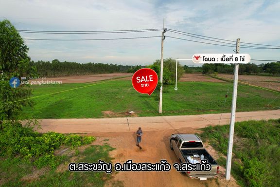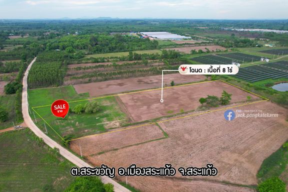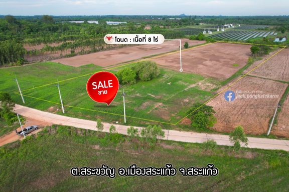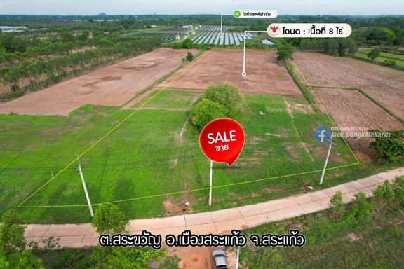 For sale, beautiful 8 rai land plot, Ban Kaeng Si Siat, Mueang Sa Kaeo District Next to a 70-meter wide concrete road, 2-phase, 3-phase electricity...