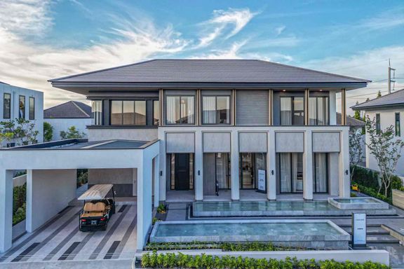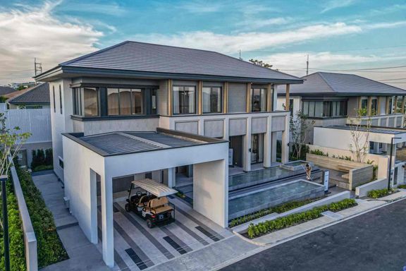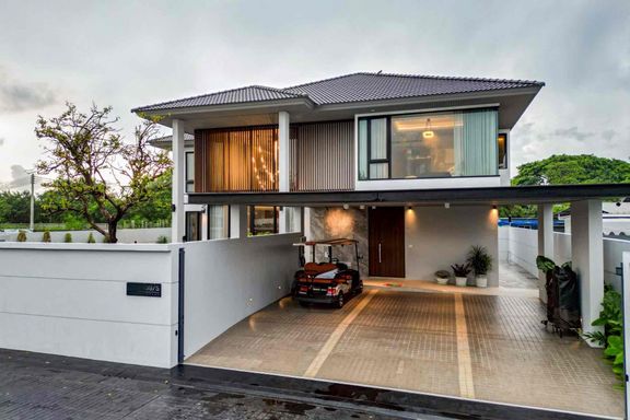 Modern tropical style 2 Storey house Located to Motorway 7 and Road 36. Price start from 22.9 Million Bath. 🏞 There are 4 bedrooms, 6 bathrooms, a ga...
